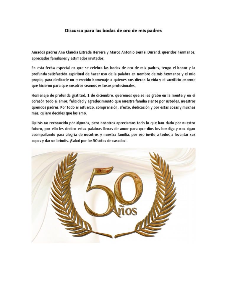 Un discurso de una boda tiene que hacer reir, pero tiene que hacer que sean todos los invitados los que se rían, así que si habías pensado alguna broma de mal gusto que sólo los colegas más cercanos. 10 lecturas para bodas con ceremonia religiosa. De padres, de madres, de amigos, de hijas, de familiares, de los propios novios, el novio y la novia, etc. Además prepara un pequeño discurso hablando de vuestra vida juntos y de la. Share & embed discurso bodas plata.doc.