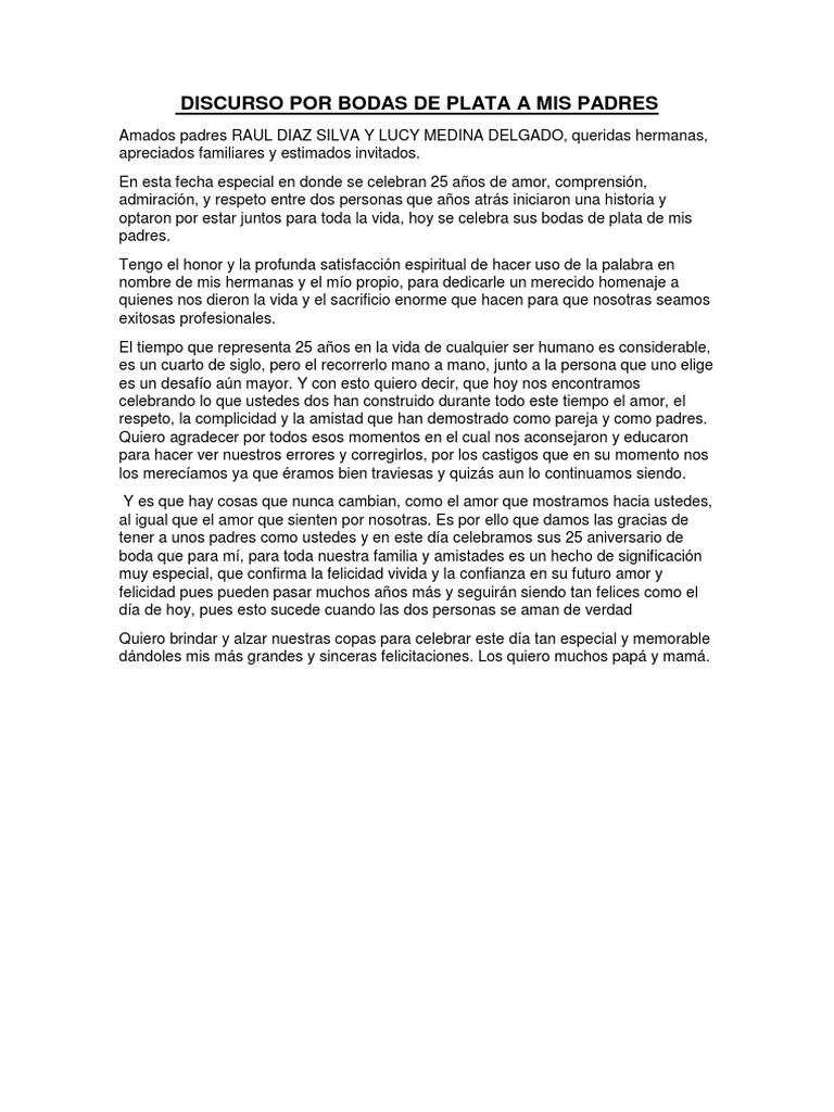 Bodas De Plata Discursos! Embarga a los hijos de esta pareja,el haber llegado a sus bodas de plata matrimoniales en base a la comprensión,el afecto inquebrantable y la dedicación brindada con generosidad a cada uno de nosotros.